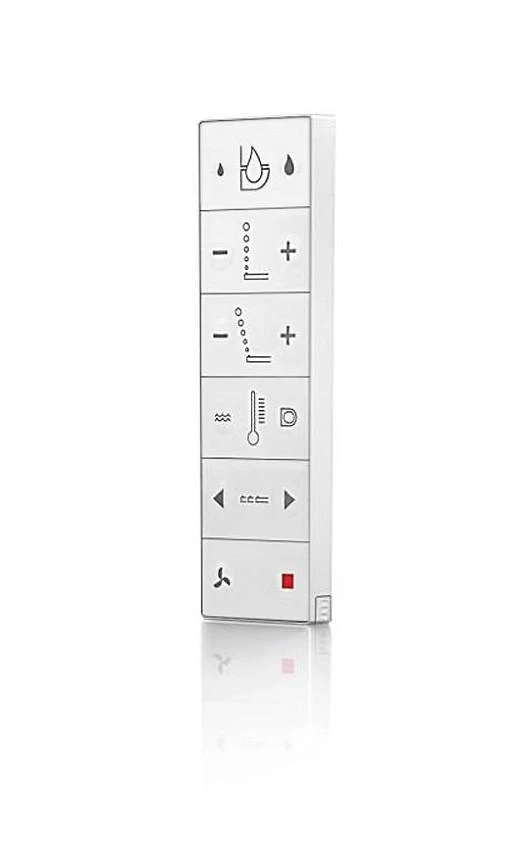 SensoWash® Starck f Liteinnovatieve afstandsbediening met vlak, elegant design voor een intuïtieve bediening van alle functies. In de energiezuinige modus wordt de verwarming van de zitting alleen geactiveerd op vooraf gespecificeerde tijdstippen en daarna uitgeschakeld, bijv. ‘s nachts.