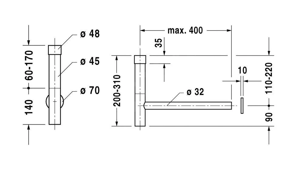 Let bij het gebruik van deze sifon op de hoogte van de afvoer vanaf de bovenrand van het keramiek tot het midden van de afvoer, volgens het technische gegevensblad.
