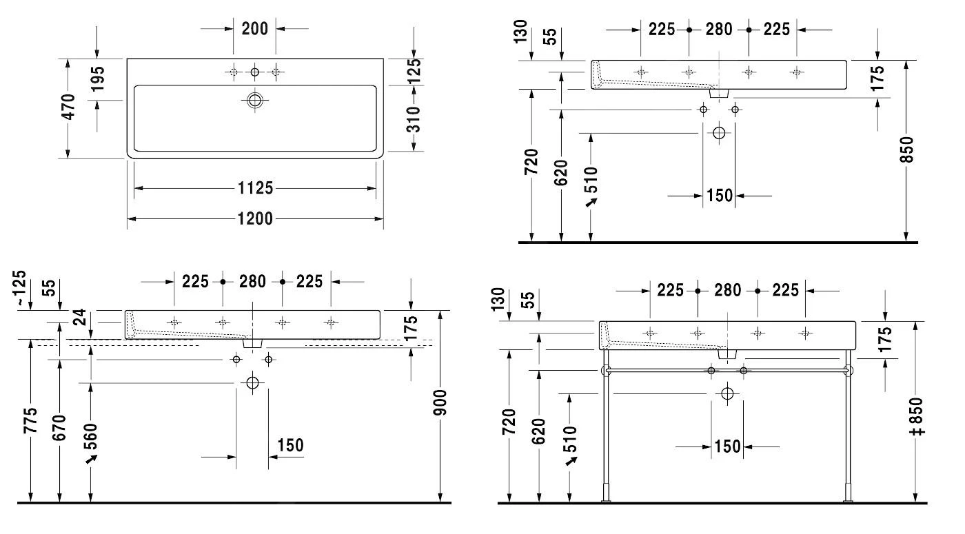 Voor wastafels met een lengte van 1000 mm en meer zijn 2 bevestigingssets nodig (niet meegeleverd).