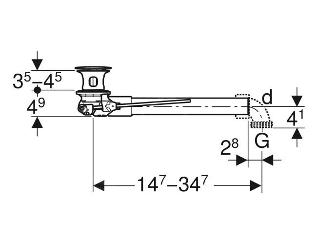 Geberit afvoergarnituur, ruimtebesparend, smalle uitvoering, met externe stop voor afvoergarnituur met hendelbediening