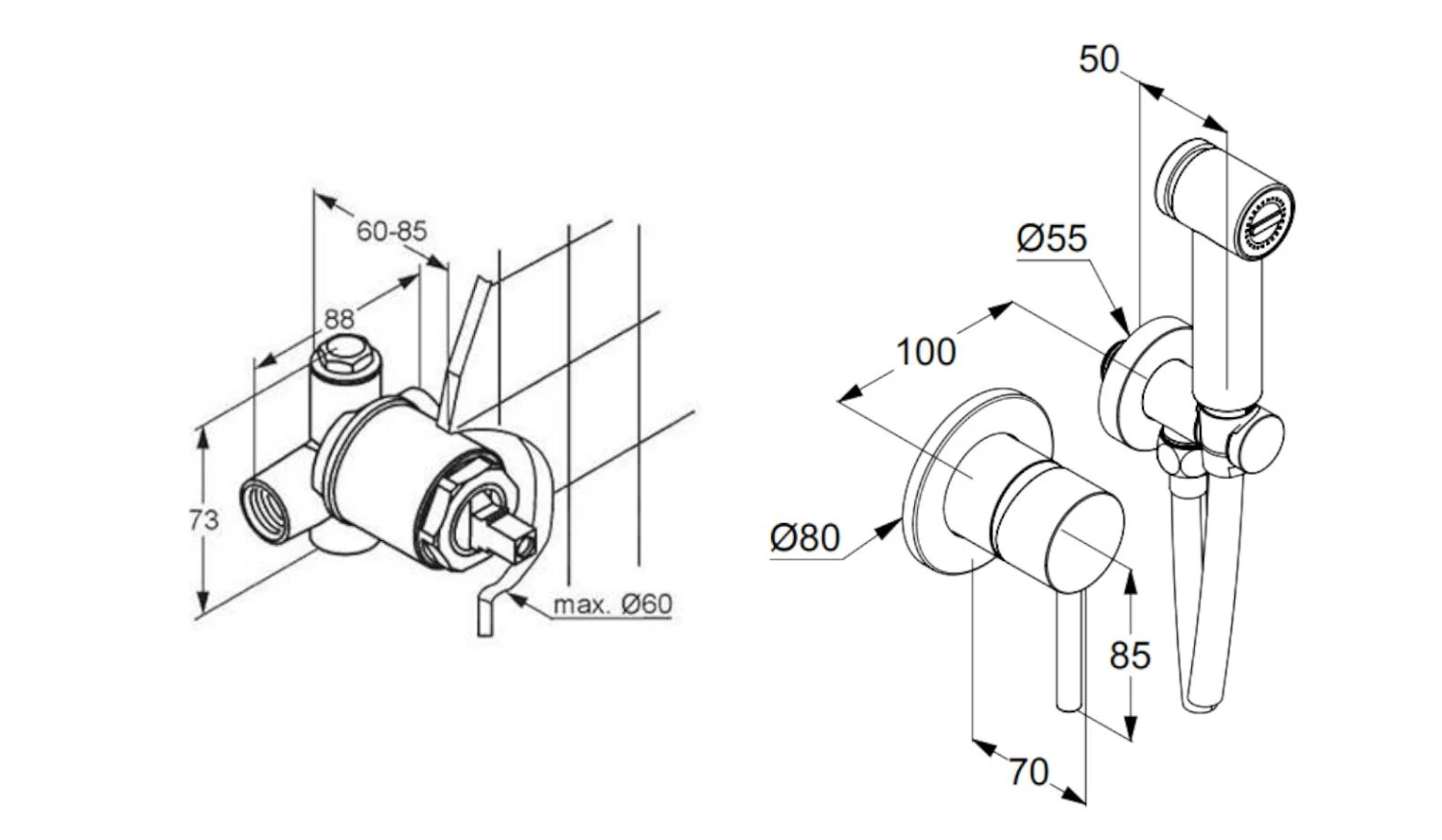 Eengreeps inbouwkraan met bidetdouche, incl. inbouwdeel