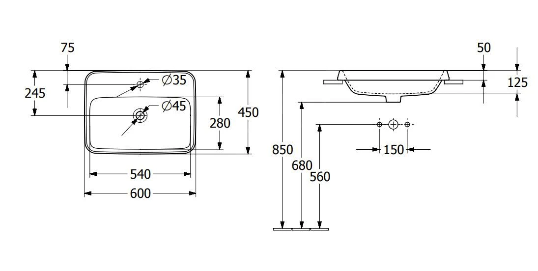 Rechthoekige inbouwwastafel