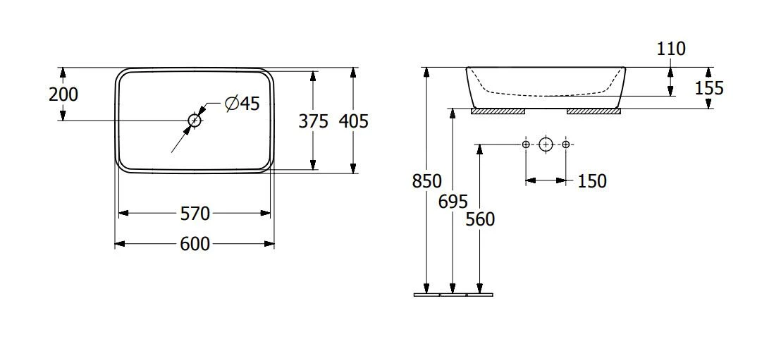 Rechthoekige wastafel voor opbouw op plaatÂ