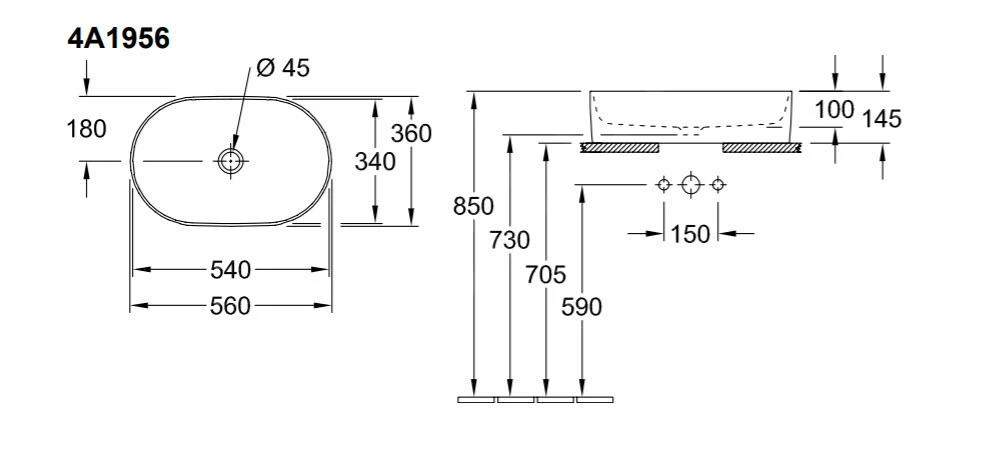 - aanbevolen montage met minimumafstand tussen achterwand van de wastafel en muur: 50 mm