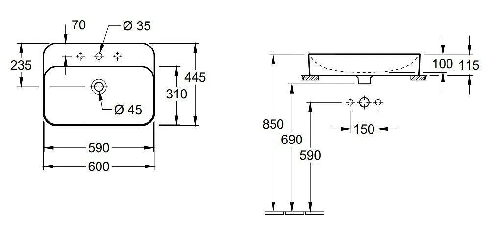 Opzetwastafel rechthoekig voor op plaat met CeramicPlus