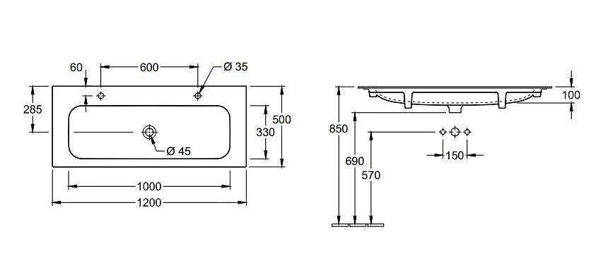 Dubbele meubelwastafel zonder overloop, met CeramicPlus, 2 kraangaten